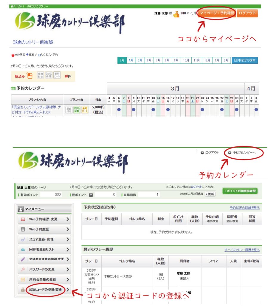 尚、認証コードはご登録いただいた翌々日(完全セルフデーは除く)までにはメールにて発行いたしますので、球磨CCからのメールは受け取れるようにしておいて下さい。