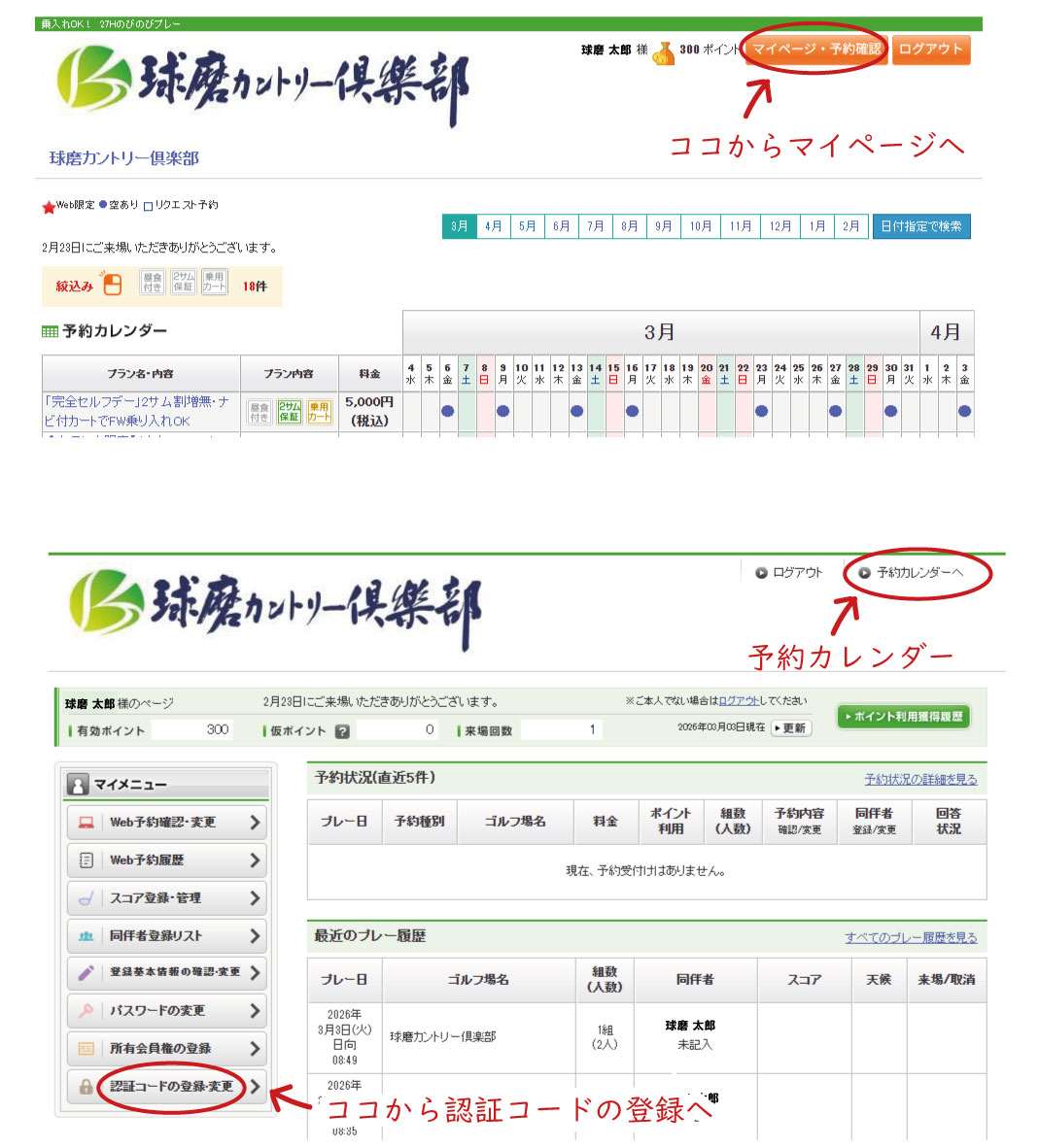 ⑦マイページTOPに戻り、マイページの画面で赤丸の「予約カレンダーへ」をクリック(上図参照)