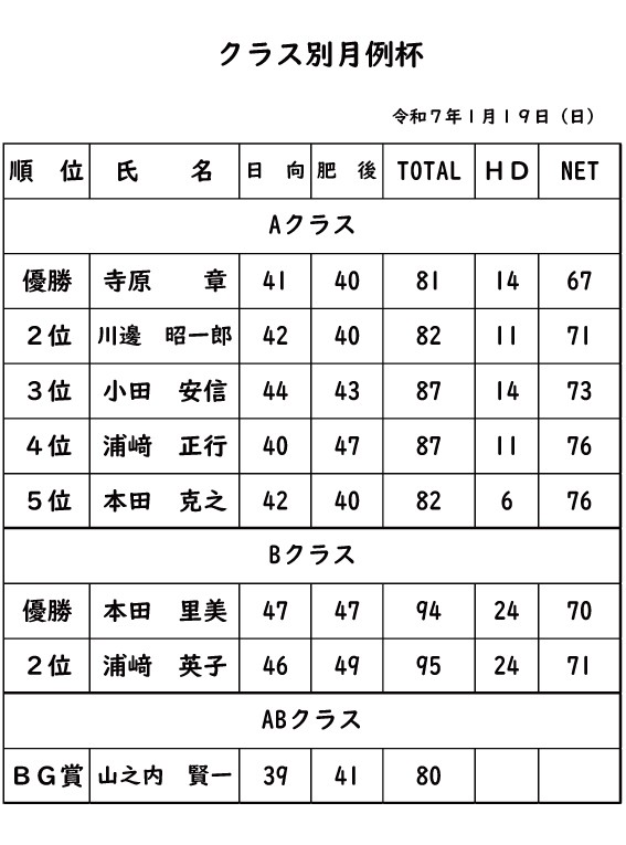 クラス別月例2025年1月19日