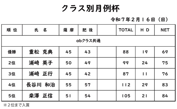 クラス別月例杯2025年2月16日