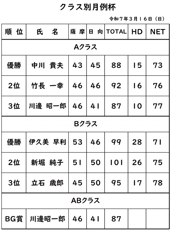 クラス別月例杯2025年3月16日