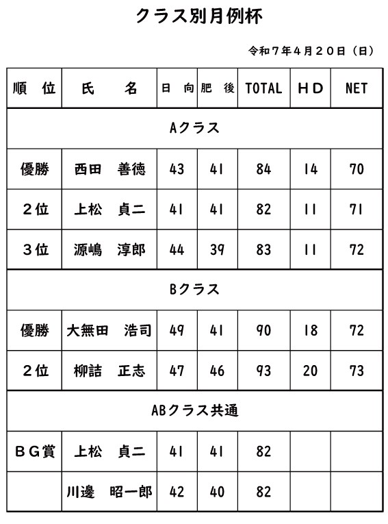クラス別月例杯2025年4月20日