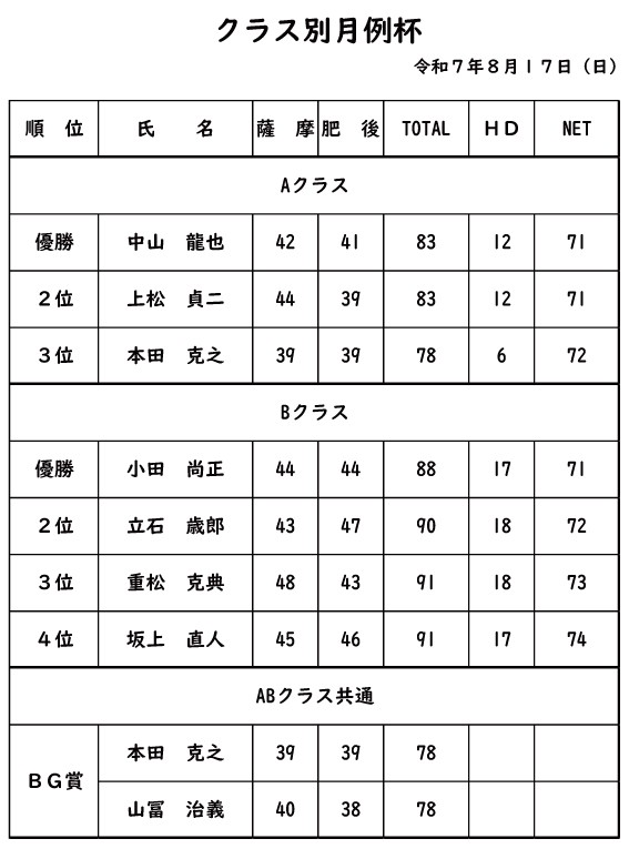 クラス別月例杯2025年8月17日