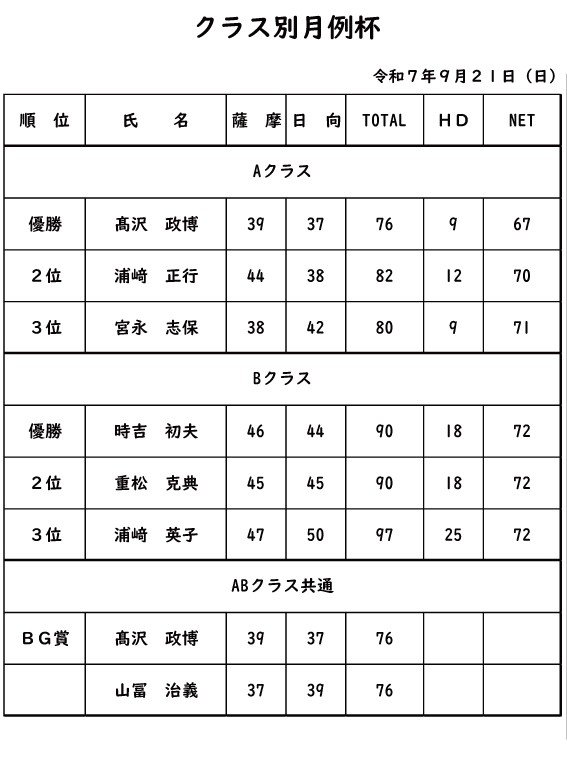 クラス別月例杯2025年9月21日